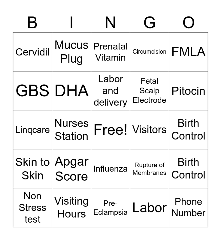 This bingo card has a free space and 39 words: Vaginal delivery, Gestational Diabetes, 1 Hour Glucola, DHA, Non Stress test, Influenza, Labor and delivery, Lactation, FMLA, Skin to Skin, Nurses Station, Circumcision, Phone Number, Birth Control, Visitors, Apgar Score, Delayed Cord Clamping, Cervidil, Vitamin K, Rupture of Membranes, GBS, Pre-Eclampsia, Fetal Scalp Electrode, Pitocin, Car Seat, Dilation, Breast Pump, Birth Plan, Urine Protein, Mucus Plug, Vacuum, Peanut Ball, Prenatal Vitamin, Visiting Hours, Labor, 8 PM, Birth Control, Linqcare and Deb Becker.