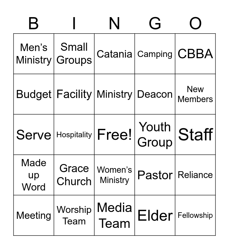 This bingo card has a free space and 28 words: Reliance, Rkids, Deacon, Elder, Budget, Catania, Small Groups, Made up Word, Youth Group, Meeting, Serve, Camping, Worship Team, Media Team, New Members, Members, Grace Church, Facility, Ministry, Women’s Ministry, Men’s Ministry, Leadership, Fellowship, Hospitality, Staff, Pastor, CBBA and Mission Team.