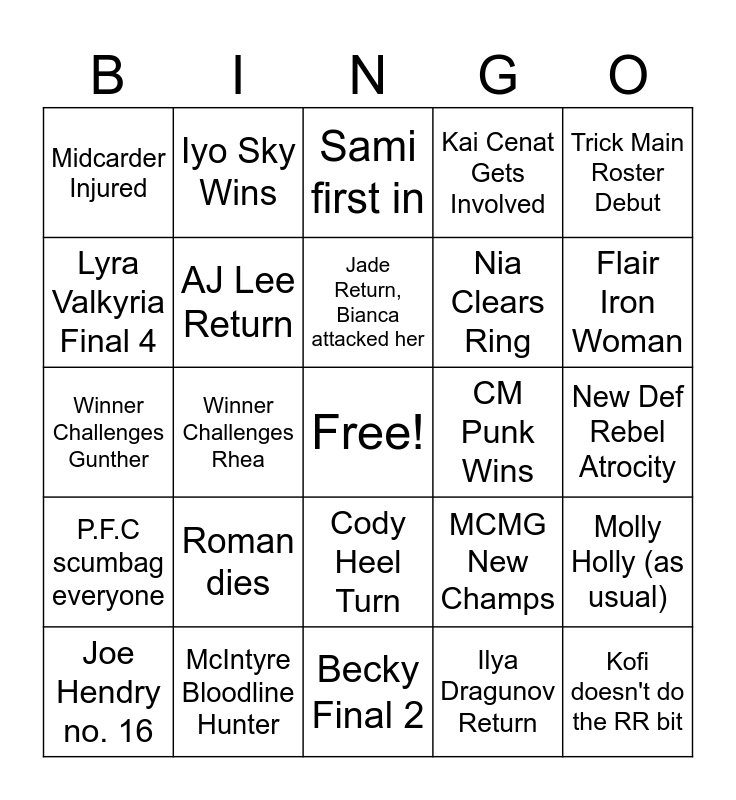 This bingo card has a free space and 24 words: Roman dies, McIntyre Bloodline Hunter, Jade Return, Bianca attacked her, Joe Hendry no. 16, Trick Main Roster Debut, Midcarder Injured, Lyra Valkyria Final 4, Iyo Sky Wins, CM Punk Wins, Cody Heel Turn, Nia Clears Ring, Winner Challenges Gunther, MCMG New Champs, Molly Holly (as usual), AJ Lee Return, Ilya Dragunov Return, New Def Rebel Atrocity, Sami first in, Flair Iron Woman, Winner Challenges Rhea, Kofi doesn't do the RR bit, P.F.C scumbag everyone, Kai Cenat Gets Involved and Becky Final 2.
