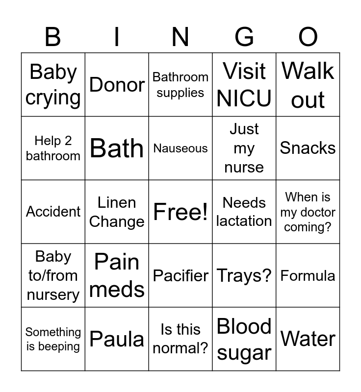 This bingo card has a free space and 24 words: Pain meds, Paula, Nauseous, Something is beeping, Walk out, Baby crying, Help 2 bathroom, Donor, Needs lactation, Pacifier, Just my nurse, Accident, Trays?, Formula, Bath, Blood sugar, When is my doctor coming?, Bathroom supplies, Snacks, Linen Change, Water, Baby to/from nursery, Visit NICU and Is this normal?.