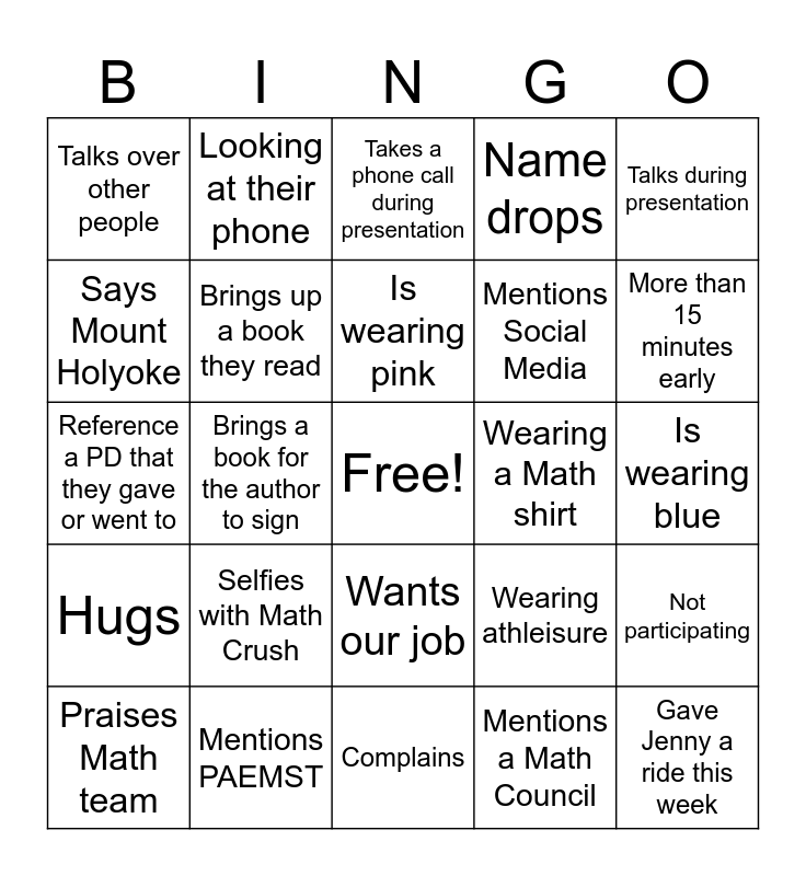 This bingo card has a free space and 24 words: Selfies with Math Crush, Mentions PAEMST, Is wearing pink, Praises Math team, Talks during presentation, Talks over other people, Says Mount Holyoke, Looking at their phone, Wearing a Math shirt, Wants our job, Mentions Social Media, Reference a PD that they gave or went to, Wearing athleisure, Not participating, Brings up a book they read, Mentions a Math Council, Is wearing blue, Takes a phone call during presentation, More than 15 minutes early, Brings a book for the author to sign, Gave Jenny a ride this week, Hugs, Name drops and Complains.