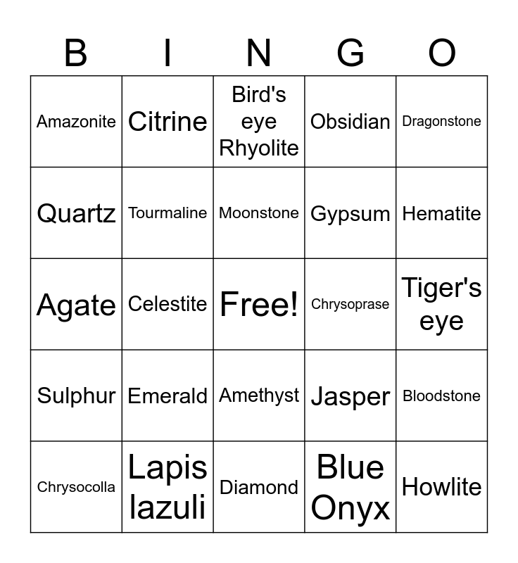 This bingo card has a free space and 25 words: Emerald, Diamond, Moonstone, Chrysocolla, Dragonstone, Amazonite, Quartz, Citrine, Chrysoprase, Amethyst, Gypsum, Agate, Jasper, Bloodstone, Tourmaline, Jade, Tiger's eye, Bird's eye Rhyolite, Hematite, Celestite, Howlite, Lapis lazuli, Sulphur, Obsidian and Blue Onyx.