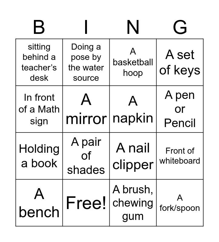 This bingo card has 16 words: Free!, Front of whiteboard, A basketball hoop, sitting behind a teacher’s desk, Holding a book, Doing a pose by the water source, A nail clipper, A brush, chewing gum, In front of a Math sign, A mirror, A bench, A set of keys, A pair of shades, A pen or Pencil, A napkin and A fork/spoon.