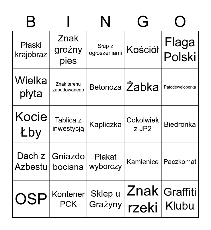This bingo card has a free space and 24 words: Gniazdo bociana, Kontener PCK, Betonoza, OSP, Flaga Polski, Płaski krajobraz, Wielka płyta, Znak groźny pies, Cokolwiek z JP2, Plakat wyborczy, Żabka, Kocie Łby, Kamienice, Paczkomat, Znak terenu zabudowanego, Znak rzeki, Biedronka, Słup z ogłoszeniami, Patodeweloperka, Tablica z inwestycją, Graffiti Klubu, Dach z Azbestu, Kościół and Sklep u Grażyny.