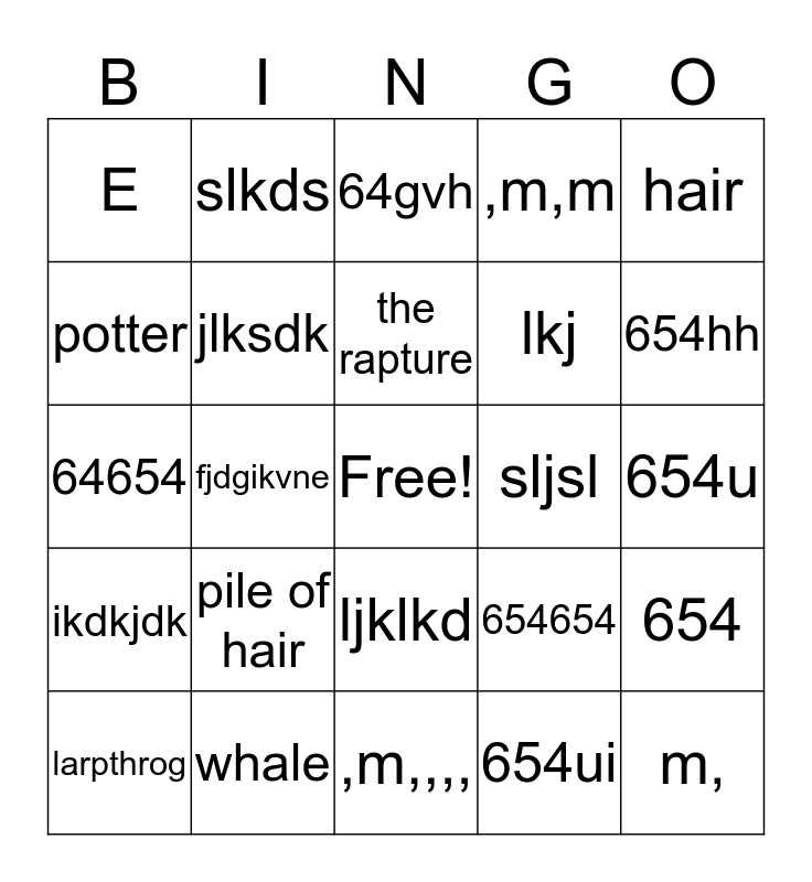 This bingo card has a free space and 24 words: pile of hair, whale, the rapture, larpthrog, hair, E, potter, slkds, sljsl, ljklkd, lkj, 64654, 654654, 654, jlksdk, 654ui, 654u, 64gvh, 654hh, fjdgikvne, m,, ikdkjdk, ,m,m and ,m,,,,.