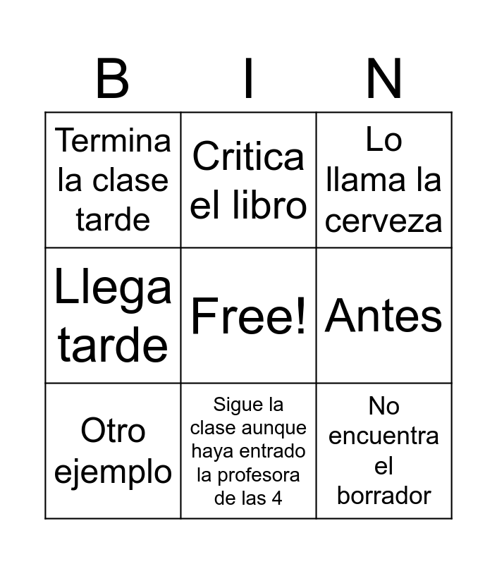 This bingo card has a free space and 8 words: Antes, Lo llama la cerveza, Critica el libro, Otro ejemplo, Termina la clase tarde, No encuentra el borrador, Llega tarde and Sigue la clase aunque haya entrado la profesora de las 4.