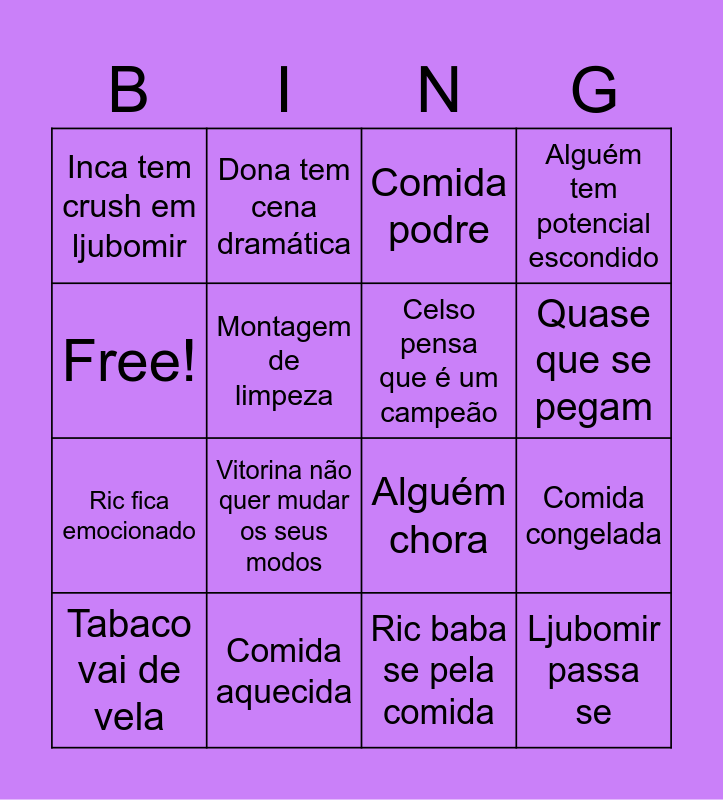This bingo card has 16 words: Comida aquecida, Comida congelada, Comida podre, Inca tem crush em ljubomir, Ric fica emocionado, Dona tem cena dramática, Alguém chora, Ric baba se pela comida, Free!, Montagem de limpeza, Tabaco vai de vela, Alguém tem potencial escondido, Vitorina não quer mudar os seus modos, Quase que se pegam, Celso pensa que é um campeão and Ljubomir passa se.