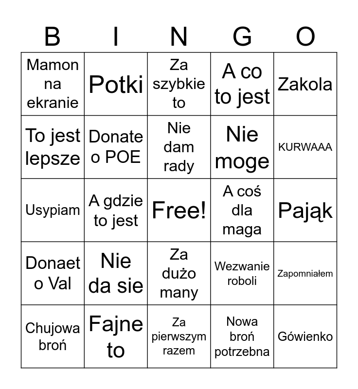 This bingo card has a free space and 24 words: Nie da sie, Fajne to, Nie dam rady, Chujowa broń, Zakola, Mamon na ekranie, To jest lepsze, Potki, A coś dla maga, Za dużo many, Nie moge, Usypiam, Wezwanie roboli, Zapomniałem, Donate o POE, Nowa broń potrzebna, Pająk, Za szybkie to, KURWAAA, A gdzie to jest, Gówienko, Donaet o Val, A co to jest and Za pierwszym razem.