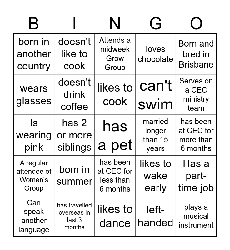 This bingo card has a free space and 24 words: born in summer, has travelled overseas in last 3 months, likes to cook, Can speak another language, Born and bred in Brisbane, born in another country, wears glasses, doesn't like to cook, married longer than 15 years, has been at CEC for less than 6 months, can't swim, Is wearing pink, likes to wake early, Has a part-time job, doesn't drink coffee, left-handed, has been at CEC for more than 6 months, Attends a midweek Grow Group, Serves on a CEC ministry team, has 2 or more siblings, plays a musical instrument, A regular attendee of Women's Group, loves chocolate and likes to dance.