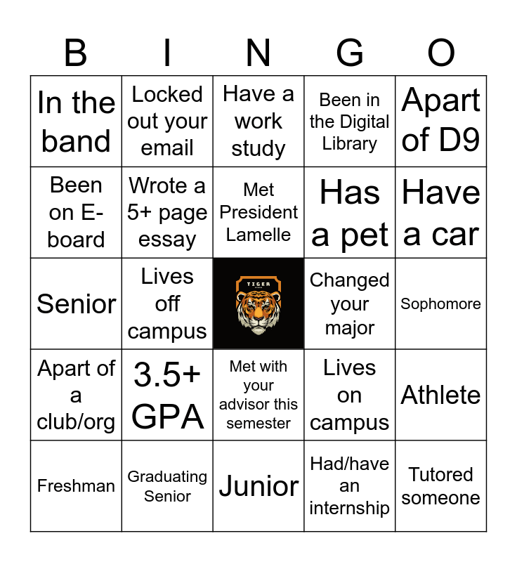 This bingo card has a free space and 24 words: 3.5+ GPΑ, Graduating Senior, Μet President Lamelle, Freshman, Apart of D9, In the band, Been on E-board, Locked out your email, Changed your major, Met with your advisor this semester, Has a pet, Senior, Lives on campus, Athlete, Wrote a 5+ page essay, Had/have an internship, Sophomore, Have a work study, Have a car, Lives off campus, Tutored someone, Apart of a club/org, Been in the Digital Library and Junior.