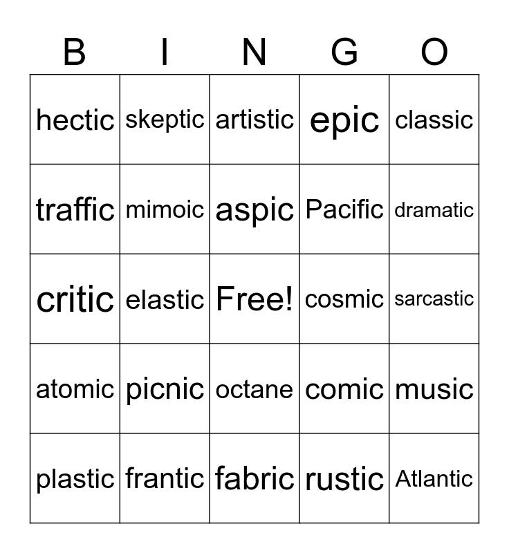 This bingo card has a free space and 24 words: picnic, frantic, aspic, plastic, classic, hectic, traffic, skeptic, cosmic, octane, Pacific, critic, comic, music, mimoic, rustic, sarcastic, artistic, dramatic, elastic, Atlantic, atomic, epic and fabric.