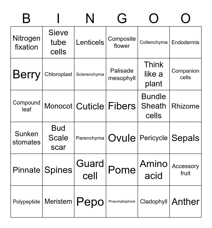 This bingo card has 38 words: Accessory fruit, Amino acid, Anther, Berry, Bud Scale scar, Bundle Sheath cells, Chloroplast, Cladophyll, Collenchyma, Sclerenchyma, Companion cells, Composite flower, Compound leaf, Cuticle, Endodermis, Fibers, Guard cell, Lenticels, Meristem, Monocot, Nitrogen fixation, Ovule, Palisade mesophyll, Parenchyma, Pepo, Pericycle, Pinnate, Pneumatophore, Polypeptide, Pome, Receptacle, Rhizome, Sepals, Sieve tube cells, Spines, Sunken stomates, Think like a plant and Vasccular cambium.