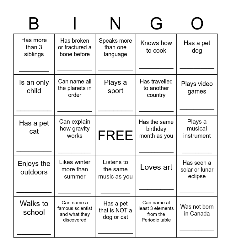This bingo card has a free space and 24 words: Likes winter more than summer __________, Can name a famous scientist and what they discovered ____________, Plays a sport _________, Walks to school ________, Has a pet dog __________, Has more than 3 siblings _________, Is an only child _________, Has broken or fractured a bone before ___________, Has the same birthday month as you ___________, Listens to the same music as you _________, Has travelled to another country ___________, Has a pet cat _________, Loves art ________, Has seen a solar or lunar eclipse ___________, Can name all the planets in order ___________, Can name at least 3 elements from the Periodic table _____________, Plays a musical instrument _________, Speaks more than one language ___________, Plays video games __________, Can explain how gravity works __________, Was not born in Canada ___________, Enjoys the outdoors _________, Knows how to cook __________ and Has a pet that is NOT a dog or cat ___________.