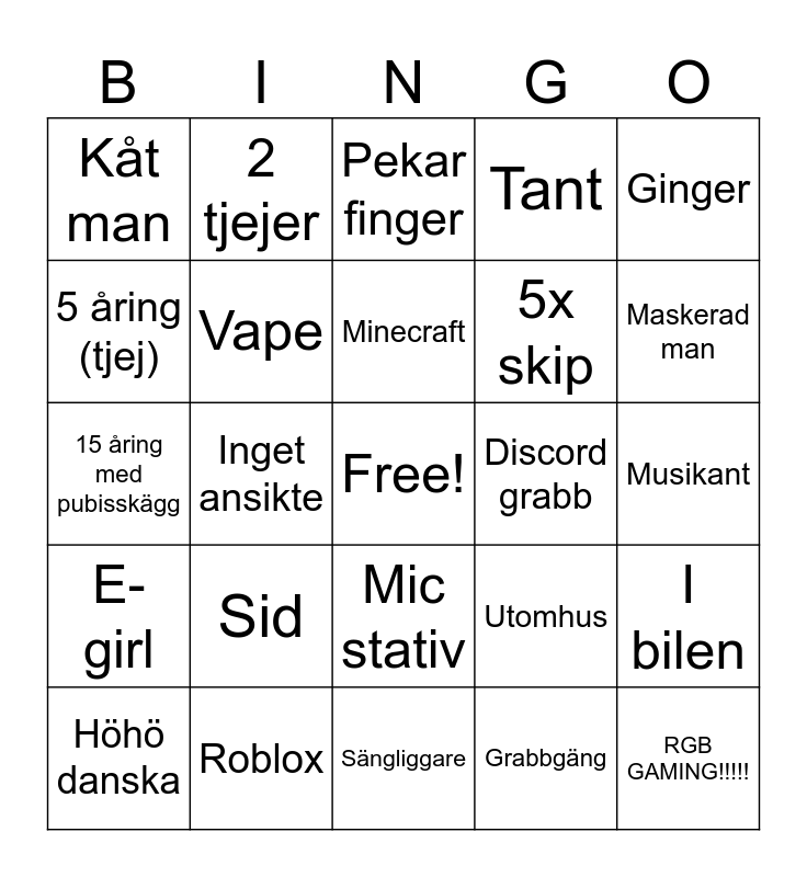 This bingo card has a free space and 24 words: Sid, Roblox, Minecraft, Höhö danska, Ginger, Kåt man, 5 åring (tjej), 2 tjejer, Discord grabb, Mic stativ, 5x skip, 15 åring med pubisskägg, Utomhus, I bilen, Vape, Grabbgäng, Musikant, Pekar finger, Maskerad man, Inget ansikte, RGB GAMING!!!!!, E-girl, Tant and Sängliggare.