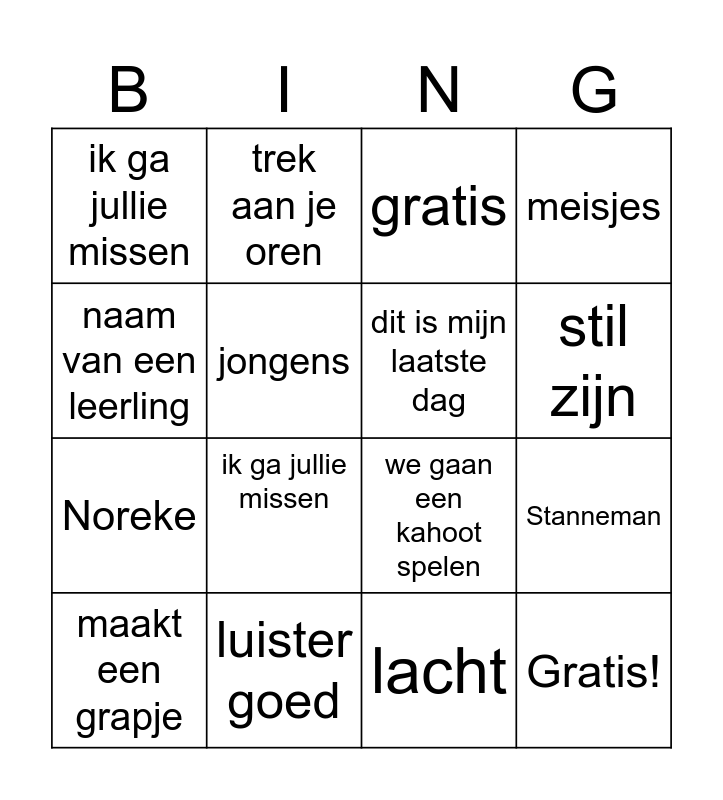 This bingo card has 18 words: ik ga jullie missen, Gratis!, gratis, ik ga jullie missen, we gaan een kahoot spelen, meisjes, maakt een grapje, trek aan je oren, stil zijn, Noreke, lacht, naam van een leerling, Stanneman, jongens, dit is mijn laatste dag, sssshhh, luister goed and laten we een feestje bouwen.