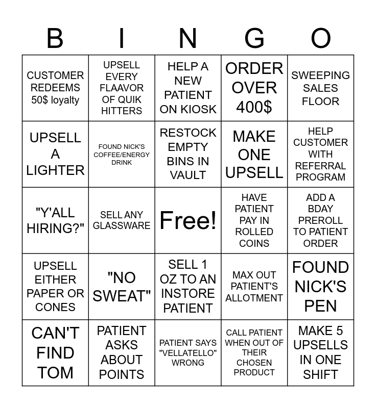 This bingo card has a free space and 24 words: "NO SWEAT", PATIENT ASKS ABOUT POINTS, RESTOCK EMPTY BINS IN VAULT, CAN'T FIND TOM, SWEEPING SALES FLOOR, CUSTOMER REDEEMS 50$ loyalty, UPSELL A LIGHTER, UPSELL EVERY FLAAVOR OF QUIK HITTERS, HAVE PATIENT PAY IN ROLLED COINS, SELL 1 OZ TO AN INSTORE PATIENT, MAKE ONE UPSELL, "Y'ALL HIRING?", MAX OUT PATIENT'S ALLOTMENT, FOUND NICK'S PEN, FOUND NICK'S COFFEE/ENERGY DRINK, CALL PATIENT WHEN OUT OF THEIR CHOSEN PRODUCT, ADD A BDAY PREROLL TO PATIENT ORDER, HELP A NEW PATIENT ON KIOSK, HELP CUSTOMER WITH REFERRAL PROGRAM, SELL ANY GLASSWARE, MAKE 5 UPSELLS IN ONE SHIFT, UPSELL EITHER PAPER OR CONES, ORDER OVER 400$ and PATIENT SAYS "VELLATELLO" WRONG.