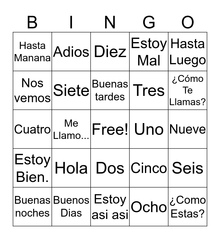 This bingo card has a free space and 24 words: Hola, Buenos Dias, Buenas tardes, Buenas noches, Hasta Luego, Hasta Manana, Nos vemos, Adios, Uno, Dos, Tres, Cuatro, Cinco, Seis, Siete, Ocho, Nueve, Diez, ¿Cómo Te Llamas?, Me Llamo..., ¿Como Estas?, Estoy Bien., Estoy Mal and Estoy asi asi.