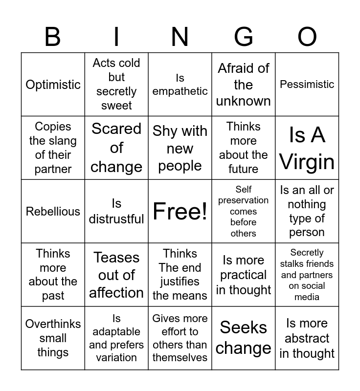 This bingo card has a free space and 24 words: Teases out of affection, Is adaptable and prefers variation, Shy with new people, Overthinks small things, Pessimistic, Optimistic, Copies the slang of their partner, Acts cold but secretly sweet, Self preservation comes before others, Thinks The end justifies the means, Thinks more about the future, Rebellious, Is more practical in thought, Secretly stalks friends and partners on social media, Scared of change, Seeks change, Is an all or nothing type of person, Is empathetic, Is A Virgin, Is distrustful, Is more abstract in thought, Thinks more about the past, Afraid of the unknown and Gives more effort to others than themselves.