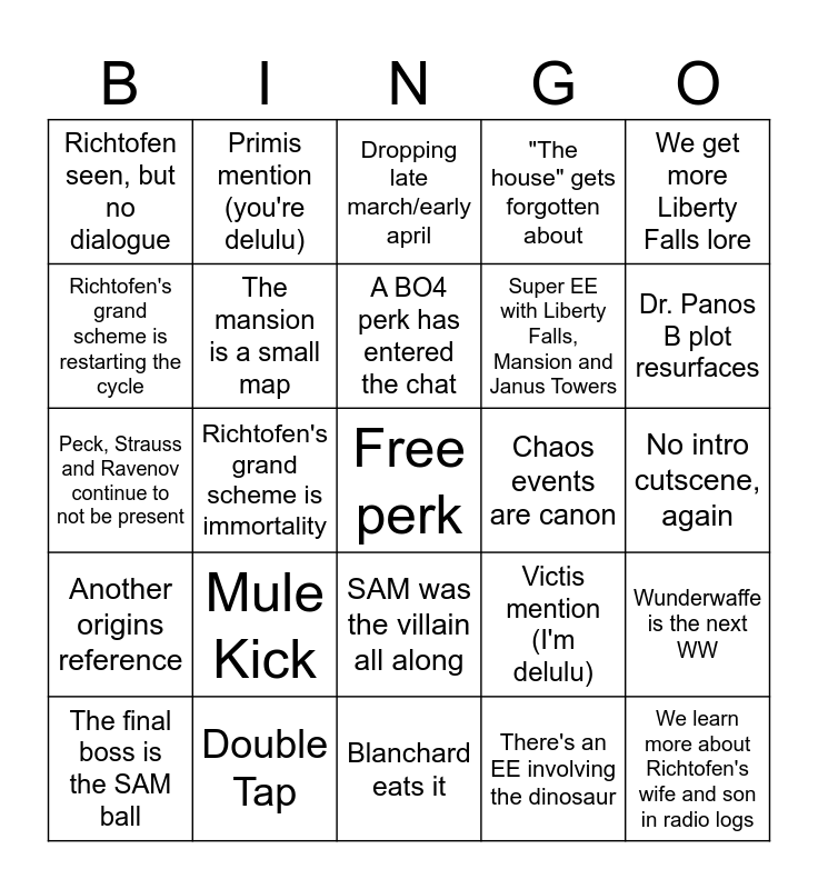 This bingo card has a free space and 24 words: Mule Kick, Double Tap, A BO4 perk has entered the chat, The final boss is the SAM ball, We get more Liberty Falls lore, Richtofen seen, but no dialogue, Richtofen's grand scheme is restarting the cycle, Primis mention (you're delulu), Chaos events are canon, SAM was the villain all along, Super EE with Liberty Falls, Mansion and Janus Towers, Peck, Strauss and Ravenov continue to not be present, Victis mention (I'm delulu), Wunderwaffe is the next WW, The mansion is a small map, There's an EE involving the dinosaur, No intro cutscene, again, Dropping late march/early april, Dr. Panos B plot resurfaces, Richtofen's grand scheme is immortality, We learn more about Richtofen's wife and son in radio logs, Another origins reference, "The house" gets forgotten about and Blanchard eats it.