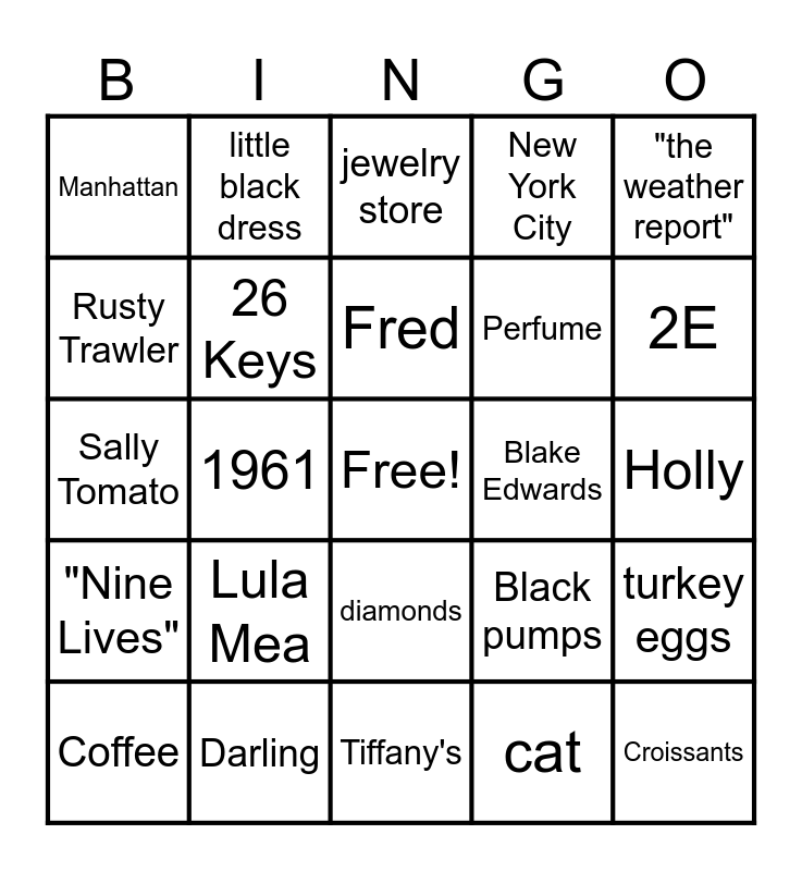 This bingo card has a free space and 24 words: Lula Mea, Darling, Fred, Coffee, "the weather report", Manhattan, Rusty Trawler, little black dress, Blake Edwards, diamonds, Perfume, Sally Tomato, Black pumps, turkey eggs, 26 Keys, cat, Holly, jewelry store, 2E, 1961, Croissants, "Nine Lives", New York City and Tiffany's.
