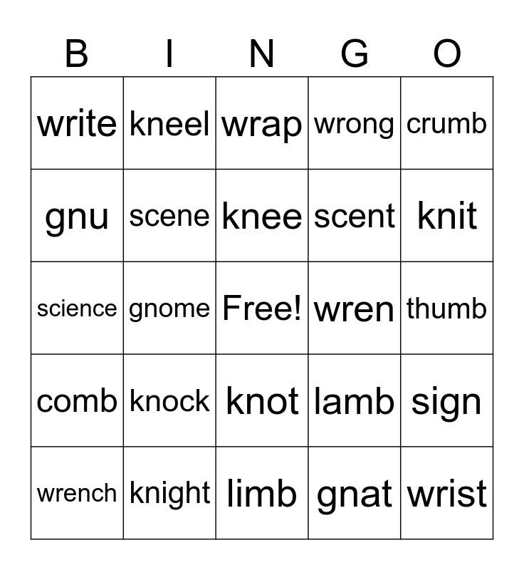 This bingo card has a free space and 24 words: knock, knight, knee, wrench, crumb, write, gnu, kneel, wren, knot, scent, science, lamb, sign, scene, gnat, thumb, wrap, knit, gnome, wrist, comb, wrong and limb.