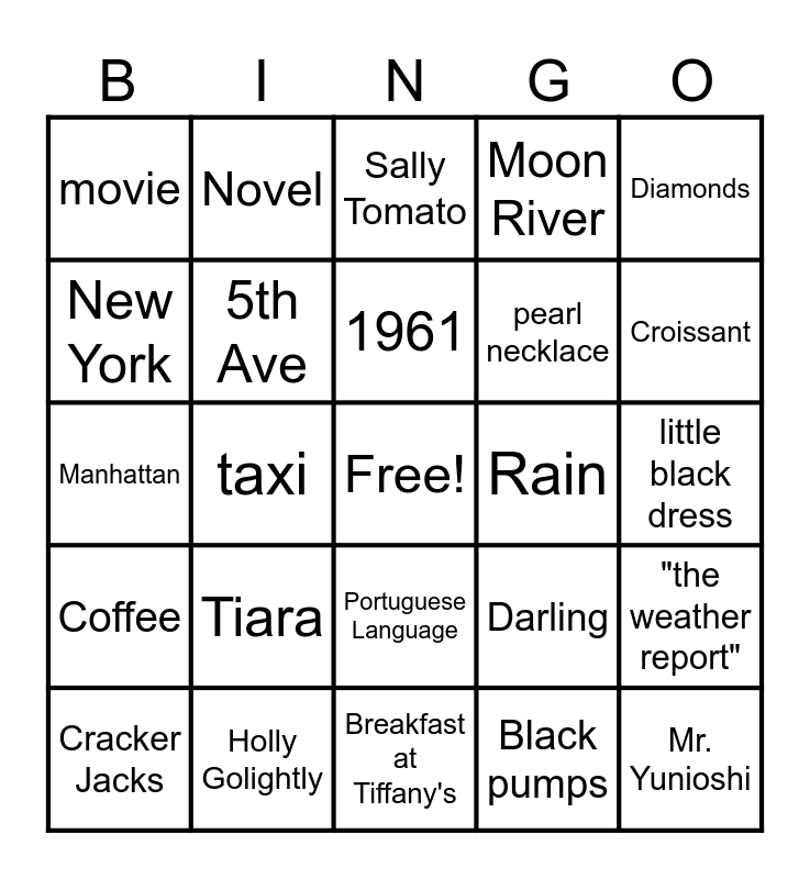 This bingo card has a free space and 24 words: Tiara, Holly Golightly, 1961, Cracker Jacks, Diamonds, movie, New York, Novel, Rain, Portuguese Language, pearl necklace, Manhattan, Darling, "the weather report", 5th Ave, Black pumps, little black dress, Sally Tomato, Croissant, taxi, Mr. Yunioshi, Coffee, Moon River and Breakfast at Tiffany's.