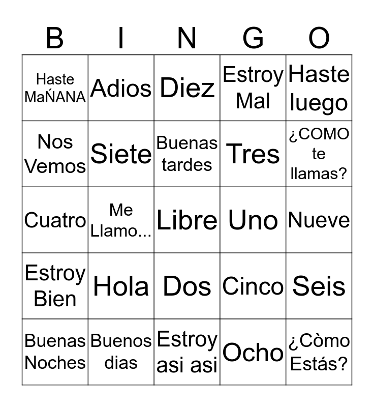 This bingo card has a free space and 24 words: Hola, Buenos dias, Buenas tardes, Buenas Noches, Haste luego, Haste MaŃANA, Nos Vemos, Adios, Uno, Dos, Tres, Cuatro, Cinco, Seis, Siete, Ocho, Nueve, Diez, ¿COMO te llamas?, Me Llamo..., ¿Còmo Estás?, Estroy Bien, Estroy Mal and Estroy asi asi.