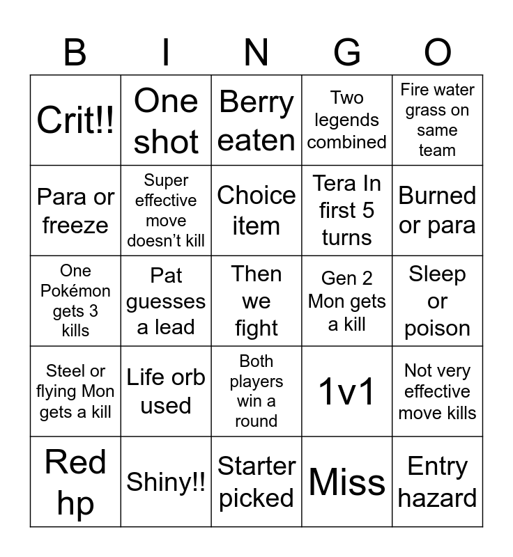 This bingo card has a free space and 24 words: Life orb used, Shiny!!, Choice item, Red hp, Fire water grass on same team, Crit!!, Para or freeze, One shot, Gen 2 Mon gets a kill, Both players win a round, Tera In first 5 turns, One Pokémon gets 3 kills, 1v1, Not very effective move kills, Super effective move doesn’t kill, Miss, Sleep or poison, Berry eaten, Burned or para, Pat guesses a lead, Entry hazard, Steel or flying Mon gets a kill, Two legends combined and Starter picked.
