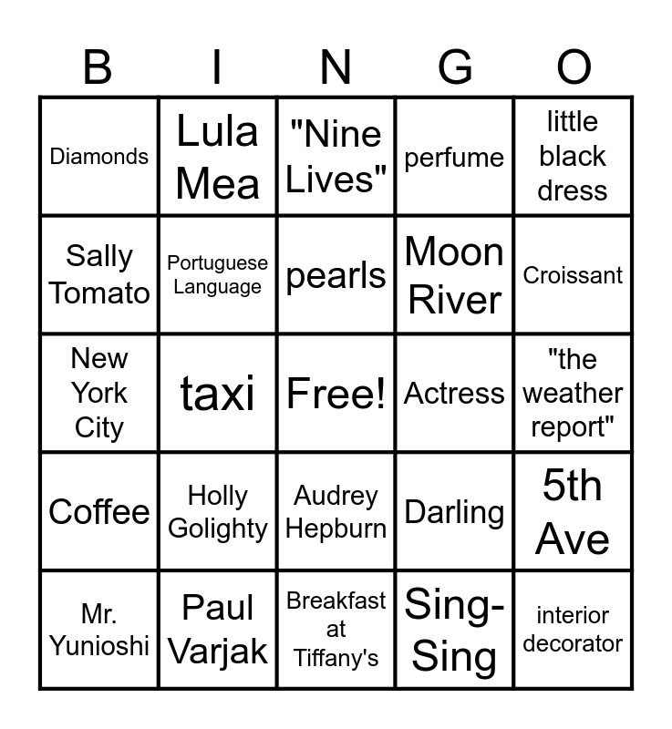 This bingo card has a free space and 24 words: Holly Golighty, Paul Varjak, pearls, Mr. Yunioshi, little black dress, Diamonds, Sally Tomato, Lula Mea, Actress, Audrey Hepburn, Moon River, New York City, Darling, 5th Ave, Portuguese Language, Sing-Sing, "the weather report", "Nine Lives", Croissant, taxi, interior decorator, Coffee, perfume and Breakfast at Tiffany's.