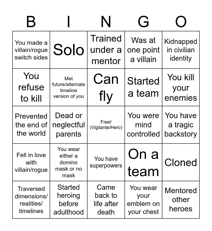This bingo card has a free space and 24 words: You wear either a domino mask or no mask, Started heroing before adulthood, Can fly, Traversed dimensions/ realities/ timelines, Kidnapped in civilian identity, You made a villain/rogue switch sides, You refuse to kill, Solo, You were mind controlled, You have superpowers, Started a team, Prevented the end of the world, On a team, Cloned, Met future/alternate timeline version of you, You wear your emblem on your chest, You have a tragic backstory, Trained under a mentor, You kill your enemies, Dead or neglectful parents, Mentored other heroes, Fell in love with villain/rogue, Was at one point a villain and Came back to life after death.