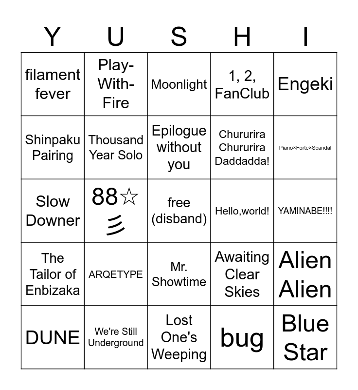 This bingo card has a free space and 24 words: ARQETYPE, We're Still Underground, Epilogue without you, DUNE, Engeki, filament fever, Shinpaku Pairing, Play-With-Fire, Hello,world!, Mr. Showtime, Chururira Chururira Daddadda!, Slow Downer, Awaiting Clear Skies, Alien Alien, Thousand Year Solo, bug, YAMINABE!!!!, Moonlight, Piano×Forte×Scandal, 88☆彡, Blue Star, The Tailor of Enbizaka, 1, 2, FanClub and Lost One's Weeping.