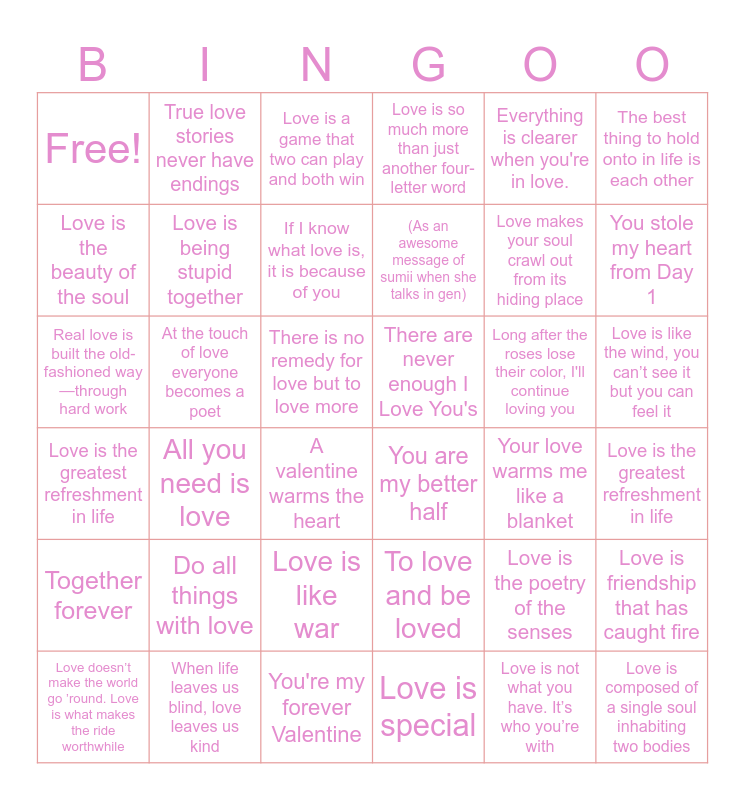 This bingo card has 36 words: To love and be loved, Love is like war, Love is special, Love is the beauty of the soul, Love is the greatest refreshment in life, There are never enough I Love You's, Love is being stupid together, You're my forever Valentine, Everything is clearer when you're in love., Love is the poetry of the senses, You stole my heart from Day 1, Love is so much more than just another four-letter word, Love is friendship that has caught fire, At the touch of love everyone becomes a poet, (As an awesome message of sumii when she talks in gen), Free!, Together forever, Long after the roses lose their color, I'll continue loving you, Real love is built the old-fashioned way—through hard work, Love is a game that two can play and both win, There is no remedy for love but to love more, All you need is love, You are my better half, A valentine warms the heart, Your love warms me like a blanket, True love stories never have endings, Love makes your soul crawl out from its hiding place, When life leaves us blind, love leaves us kind, If I know what love is, it is because of you, The best thing to hold onto in life is each other, Love is composed of a single soul inhabiting two bodies, Love doesn’t make the world go ’round. Love is what makes the ride worthwhile, Love is the greatest refreshment in life, Love is like the wind, you can’t see it but you can feel it, Do all things with love and Love is not what you have. It’s who you’re with.