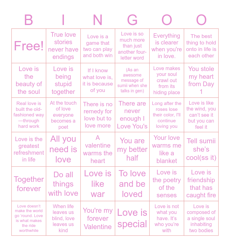 This bingo card has 36 words: To love and be loved, Love is like war, Love is special, Love is the beauty of the soul, Love is the greatest refreshment in life, There are never enough I Love You's, Love is being stupid together, You're my forever Valentine, Everything is clearer when you're in love., Love is the poetry of the senses, You stole my heart from Day 1, Love is so much more than just another four-letter word, Love is friendship that has caught fire, At the touch of love everyone becomes a poet, (As an awesome message of sumii when she talks in gen), Free!, Together forever, Long after the roses lose their color, I'll continue loving you, Real love is built the old-fashioned way—through hard work, Love is a game that two can play and both win, There is no remedy for love but to love more, All you need is love, You are my better half, A valentine warms the heart, Your love warms me like a blanket, True love stories never have endings, Love makes your soul crawl out from its hiding place, When life leaves us blind, love leaves us kind, If I know what love is, it is because of you, The best thing to hold onto in life is each other, Love is composed of a single soul inhabiting two bodies, Love doesn’t make the world go ’round. Love is what makes the ride worthwhile, Tell sumii she’s cool(ss it), Love is like the wind, you can’t see it but you can feel it, Do all things with love and Love is not what you have. It’s who you’re with.