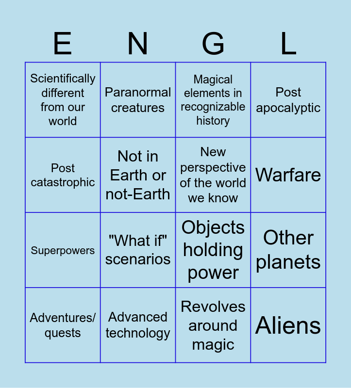 This bingo card has 16 words: Adventures/ quests, Advanced technology, Magical elements in recognizable history, Post apocalyptic, Post catastrophic, Paranormal creatures, Objects holding power, Other planets, Scientifically different from our world, Not in Earth or not-Earth, Revolves around magic, Warfare, Superpowers, "What if" scenarios, New perspective of the world we know and Aliens.