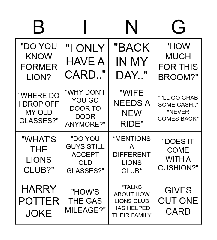 This bingo card has 16 words: HARRY POTTER JOKE, "HOW'S THE GAS MILEAGE?", "BACK IN MY DAY..", "HOW MUCH FOR THIS BROOM?", "WHERE DO I DROP OFF MY OLD GLASSES?", "I ONLY HAVE A CARD..", *MENTIONS A DIFFERENT LIONS CLUB*, "DOES IT COME WITH A CUSHION?", "DO YOU KNOW FORMER LION?, "WHY DON'T YOU GO DOOR TO DOOR ANYMORE?", *TALKS ABOUT HOW LIONS CLUB HAS HELPED THEIR FAMILY, "I'LL GO GRAB SOME CASH.." *NEVER COMES BACK*, "WHAT'S THE LIONS CLUB?", "DO YOU GUYS STILL ACCEPT OLD GLASSES?", "WIFE NEEDS A NEW RIDE" and GIVES OUT ONE CARD.