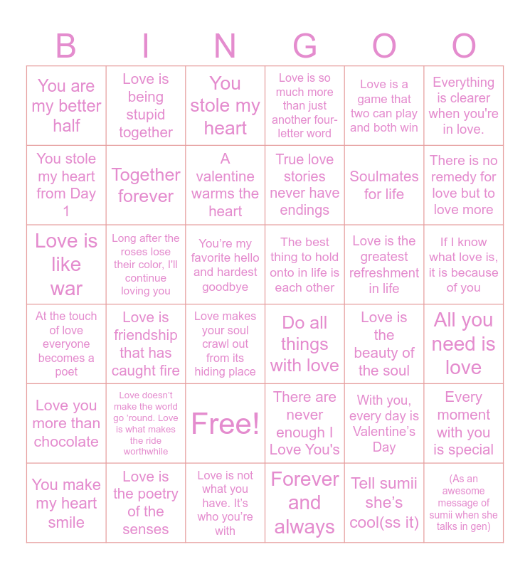This bingo card has 48 words: To love and be loved, Love is like war, Love is special, Love is the beauty of the soul, Love is the greatest refreshment in life, There are never enough I Love You's, Love is being stupid together, You're my forever Valentine, Everything is clearer when you're in love., Love is the poetry of the senses, You stole my heart from Day 1, Love is so much more than just another four-letter word, Love is friendship that has caught fire, At the touch of love everyone becomes a poet, (As an awesome message of sumii when she talks in gen), Free!, Together forever, Long after the roses lose their color, I'll continue loving you, Real love is built the old-fashioned way—through hard work, Love is a game that two can play and both win, There is no remedy for love but to love more, All you need is love, You are my better half, A valentine warms the heart, Your love warms me like a blanket, True love stories never have endings, Love makes your soul crawl out from its hiding place, When life leaves us blind, love leaves us kind, If I know what love is, it is because of you, The best thing to hold onto in life is each other, Love is composed of a single soul inhabiting two bodies, Love doesn’t make the world go ’round. Love is what makes the ride worthwhile, Tell sumii she’s cool(ss it), Love is like the wind, you can’t see it but you can feel it, Do all things with love, Love is not what you have. It’s who you’re with, Forever and always, You’re my favorite hello and hardest goodbye, You make my heart smile, Love never fails, With you, every day is Valentine’s Day, Love you more than chocolate, You stole my heart, Made for each other, Soulmates for life, Love grows here, Every moment with you is special and You are my greatest adventure.
