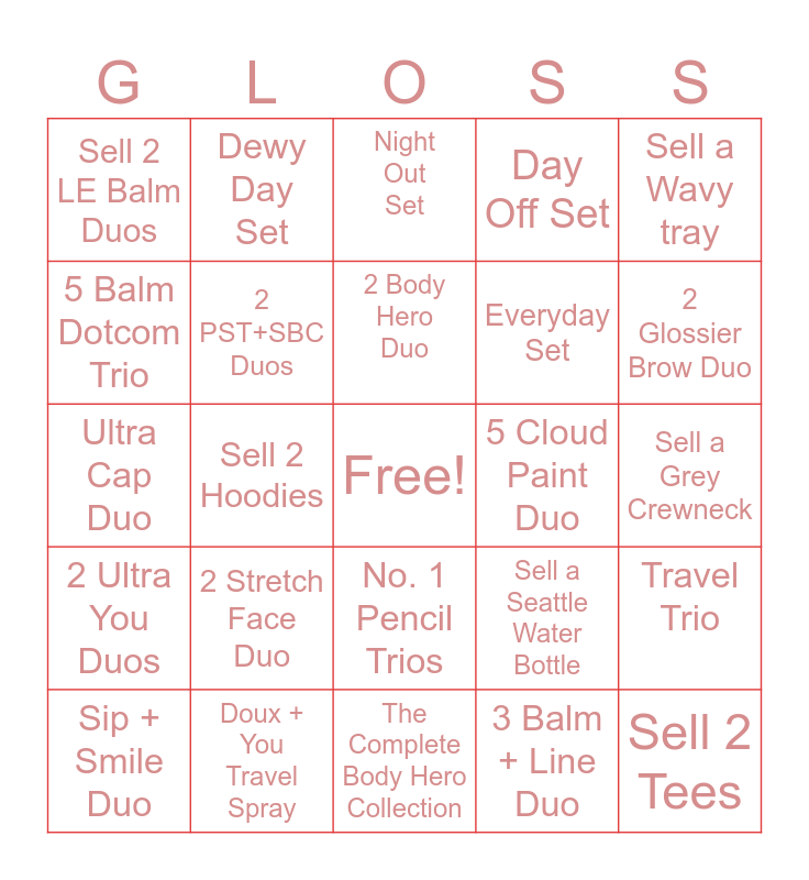 This bingo card has a free space and 28 words: Travel Trio, Date Night Set, Everyday Set, 3 Balm + Line Duo, 5 Balm Dotcom Trio, Night Out Set, Dewy Day Set, 2 Ultra You Duos, 5 Cloud Paint Duo, Sip + Smile Duo, Ultra Cap Duo, Day Off Set, Doux + You Travel Spray, The Complete Body Hero Collection, 2 Glossier Brow Duo, 3 Lash Slick Duo, 2 Stretch Face Duo, 2 PST+SBC Duos, 2 Body Hero Duo, No. 1 Pencil Trios, Sell 2 LE Balm Duos, Super pack, Sell 2 Tees, Sell 2 Hoodies, Sell a Grey Crewneck, Sell a Seattle Water Bottle, Sell a Wavy tray and Sell 2 Brushes.