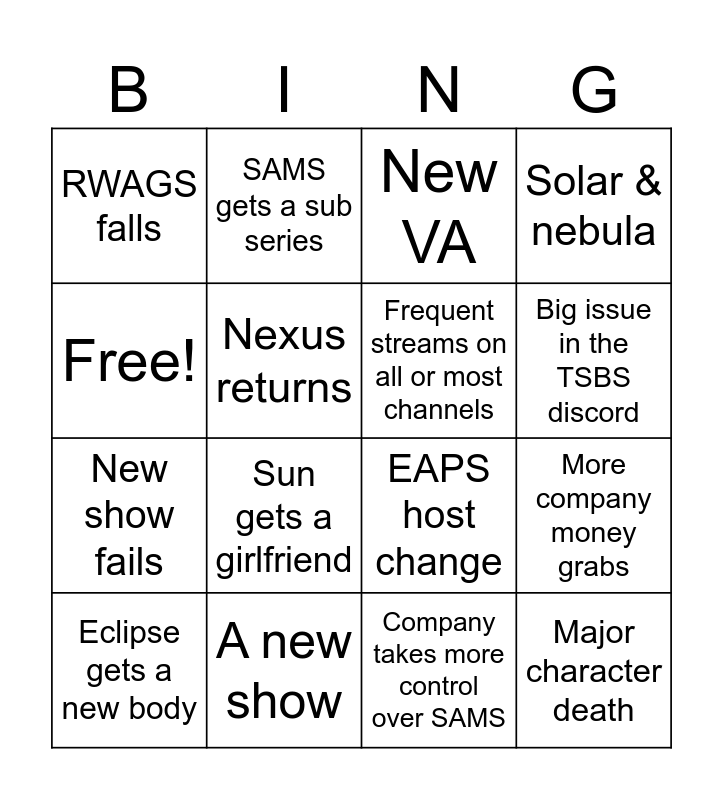 This bingo card has 16 words: A new show, More company money grabs, New VA, RWAGS falls, New show fails, SAMS gets a sub series, EAPS host change, Company takes more control over SAMS, Free!, Nexus returns, Eclipse gets a new body, Solar & nebula, Sun gets a girlfriend, Big issue in the TSBS discord, Frequent streams on all or most channels and Major character death.