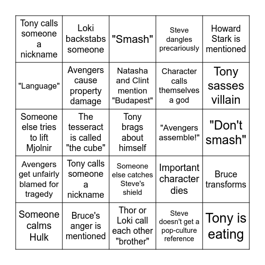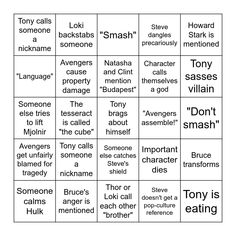 This bingo card has 36 words: Stan Lee cameo, A hero is shirtless or bare-chested, We learn the truth about a character, Avengers cause property damage, Important character dies, Avengers get unfairly blamed for tragedy, Natasha and Clint mention "Budapest", Fury is sassy, Howard Stark is mentioned, Coulson fanboys, The tesseract is called "the cube", Steve dangles precariously, Avenger's group pose, "Avengers assemble!", Tony sasses villain, Tony calls someone a nickname, Tony is eating, Tony calls someone a nickname, Tony brags about himself, "Smash", "Don't smash", Bruce transforms, Bruce's anger is mentioned, Someone calms Hulk, Thor or Loki call each other "brother", Loki backstabs someone, Someone else tries to lift Mjolnir, Thor accidentally breaks something, Character calls themselves a god, "Language", Steve looks at his picture of Peggy, Steve throws his shield, Steve doesn't get a pop-culture reference, Someone else catches Steve's shield, Tony wears tanktop and Tony doesn't want things handed to him.