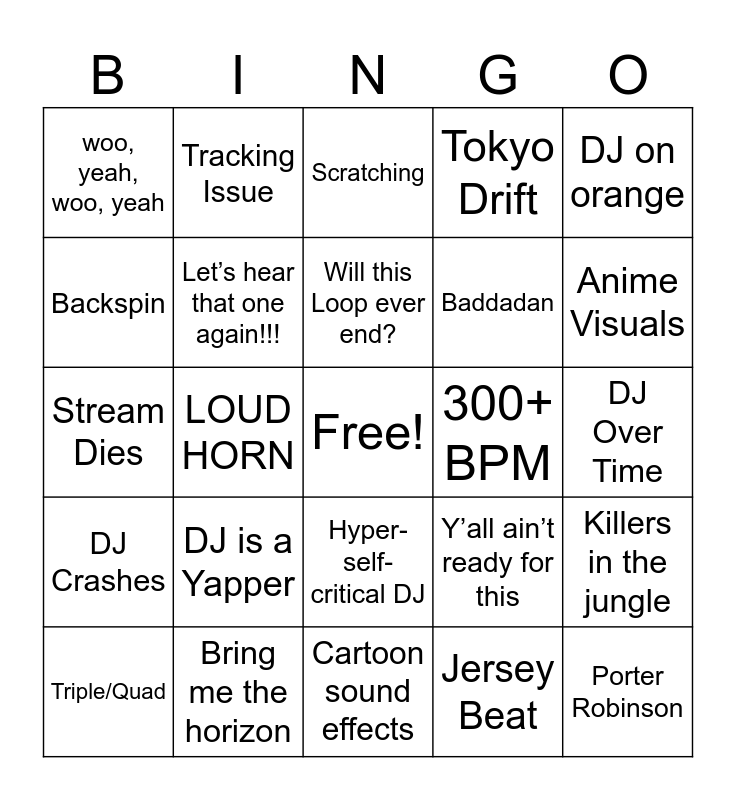 This bingo card has a free space and 28 words: Killers in the jungle, Squeaky Bed, Baddadan, Jersey Beat, Backspin, Scratching, Tracking Issue, DJ Crashes, 300+ BPM, Triple/Quad, Stream Dies, Tokyo Drift, Bring me the horizon, Cartoon sound effects, Anime Visuals, Riddim, DJ is a Yapper, Let’s hear that one again!!!, Will this Loop ever end?, Hyper-self-critical DJ, woo, yeah, woo, yeah, Abrupt Tempo swap, Porter Robinson, LOUD HORN, DJ Over Time, Y’all ain’t ready for this, DJ on orange and Aint got No Backbone.