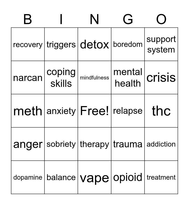 This bingo card has a free space and 24 words: sobriety, balance, mindfulness, dopamine, support system, recovery, narcan, triggers, relapse, therapy, mental health, meth, trauma, addiction, coping skills, opioid, thc, detox, crisis, anxiety, treatment, anger, boredom and vape.