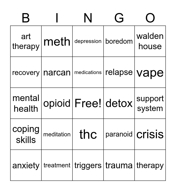 This bingo card has a free space and 34 words: sobriety, balance, mindfulness, dopamine, support system, recovery, narcan, triggers, relapse, therapy, mental health, meth, trauma, addiction, coping skills, opioid, thc, detox, crisis, anxiety, treatment, anger, boredom, vape, journaling, meditation, depression, 12 steps, walden house, art therapy, setback, medications, paranoid and stress.