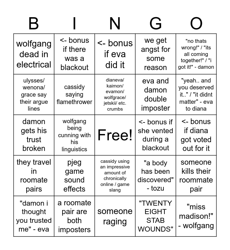 This bingo card has a free space and 24 words: "damon i thought you trusted me" - eva, pjeg game sound effects, dianeva/ kaimon/ evamon/ wolfgrace/ jetskii/ etc. crumbs, "TWENTY EIGHT STAB WOUNDS", "no thats wrong!" / "its all coming together!" / "i got it!" - damon, wolfgang dead in electrical, <- bonus if there was a blackout, <- bonus if eva did it, <- bonus if she vented during a blackout, <- bonus if diana got voted out for it, damon gets his trust broken, cassidy saying flamethrower, "a body has been discovered" - tozu, someone kills their roommate pair, ulysses/ wenona/ grace say their argue lines, a roomate pair are both imposters, someone raging, we get angst for some reason, "yeah.. and you deserved it.." / "it didnt matter" - eva to diana, they travel in roomate pairs, wolfgang being cunning with his linguistics, cassidy using an impressive amount of chronically online / game slang, eva and damon double imposter and "miss madison!" - wolfgang.