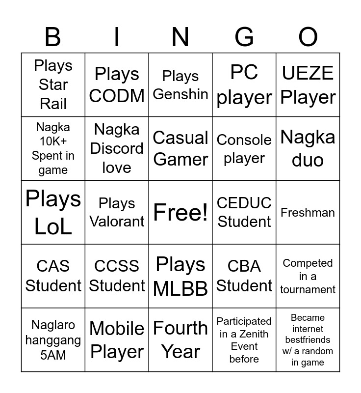 This bingo card has a free space and 24 words: CCSS Student, Mobile Player, Casual Gamer, Naglaro hanggang 5AM, UEZE Player, Plays Star Rail, Nagka 10K+ Spent in game, Plays CODM, CEDUC Student, Plays MLBB, Console player, Plays LoL, CBA Student, Competed in a tournament, Nagka Discord love, Participated in a Zenith Event before, Freshman, Plays Genshin, Nagka duo, Plays Valorant, Became internet bestfriends w/ a random in game, CAS Student, PC player and Fourth Year.