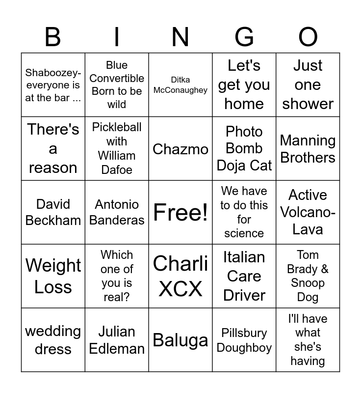This bingo card has a free space and 24 words: Which one of you is real?, Julian Edleman, Chazmo, wedding dress, Just one shower, Shaboozey- everyone is at the bar ..., There's a reason, Blue Convertible Born to be wild, We have to do this for science, Charli XCX, Photo Bomb Doja Cat, David Beckham, Italian Care Driver, Tom Brady & Snoop Dog, Pickleball with William Dafoe, Pillsbury Doughboy, Active Volcano- Lava, Ditka McConaughey, Manning Brothers, Antonio Banderas, I'll have what she's having, Weight Loss, Let's get you home and Baluga.