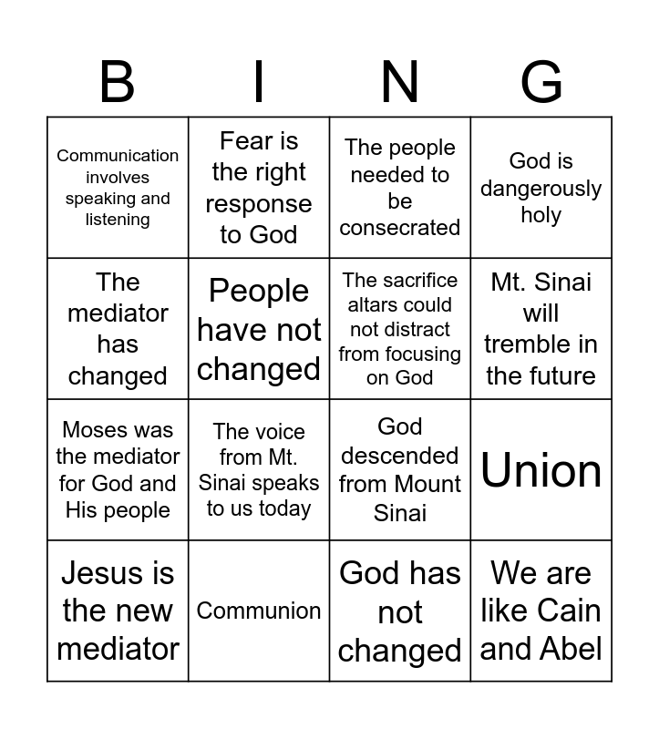 This bingo card has 16 words: Communion, Union, The people needed to be consecrated, Communication involves speaking and listening, Moses was the mediator for God and His people, Fear is the right response to God, God descended from Mount Sinai, God has not changed, The mediator has changed, People have not changed, Jesus is the new mediator, God is dangerously holy, The voice from Mt. Sinai speaks to us today, Mt. Sinai will tremble in the future, The sacrifice altars could not distract from focusing on God and We are like Cain and Abel.