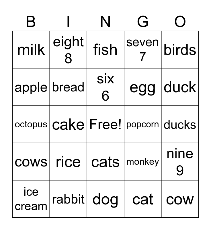 This bingo card has a free space and 29 words: ice cream, pizza, cake, chicken, milk, fish, bread, rice, popcorn, rabbit, ducks, cow, dog, cat, duck, dogs, cats, cows, birds, octopus, monkey, panda, egg, apple, seven 7, eight 8, nine 9, six 6 and five 5.