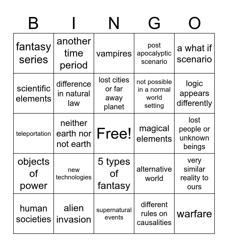 This bingo card has a free space and 24 words: new technologies, alien invasion, lost cities or far away planet, human societies, a what if scenario, fantasy series, scientific elements, another time period, magical elements, 5 types of fantasy, not possible in a normal world setting, teleportation, alternative world, very similar reality to ours, difference in natural law, different rules on causalities, lost people or unknown beings, vampires, logic appears differently, neither earth nor not earth, warfare, objects of power, post apocalyptic scenario and supernatural events.