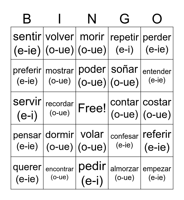 This bingo card has a free space and 29 words: querer (e-ie), comenzar (e-ie), recordar (o-ue), devolver (o-ue), sentir (e-ie), morir (o-ue), mostrar (o-ue), dormir (o-ue), contar (o-ue), encontrar (o-ue), costar (o-ue), empezar (e-ie), pedir (e-i), almorzar (o-ue), entender (e-ie), defender (e-ie), volar (o-ue), pensar (e-ie), perder (e-ie), servir (e-i), confesar (e-ie), resolver (o-ue), soñar (o-ue), preferir (e-ie), repetir (e-i), volver (o-ue), referir (e-ie), poder (o-ue) and cerrar (e-ie).