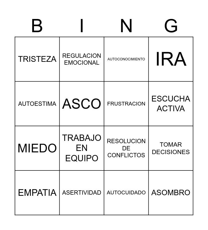This bingo card has 16 words: EMPATIA, ASERTIVIDAD, AUTOCONOCIMIENTO, IRA, AUTOESTIMA, REGULACION EMOCIONAL, RESOLUCION DE CONFLICTOS, TOMAR DECISIONES, TRISTEZA, ASCO, AUTOCUIDADO, ESCUCHA ACTIVA, MIEDO, TRABAJO EN EQUIPO, FRUSTRACION and ASOMBRO.